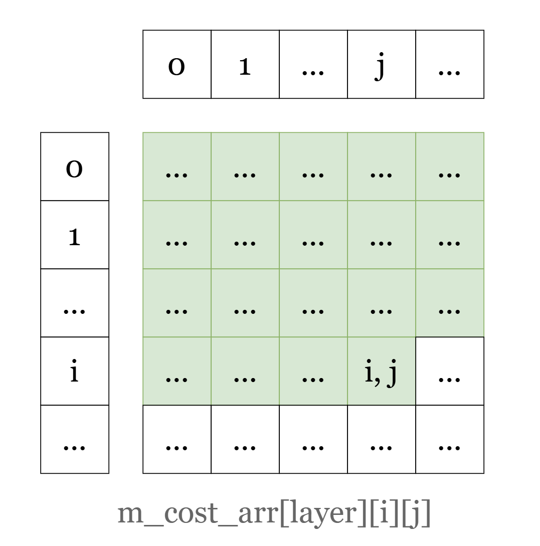 That is: value in m_cost_arr[layer][i][j] is the solution for sub-question when only considering highlighted nodes from to with maximum allowed transportation count layer.