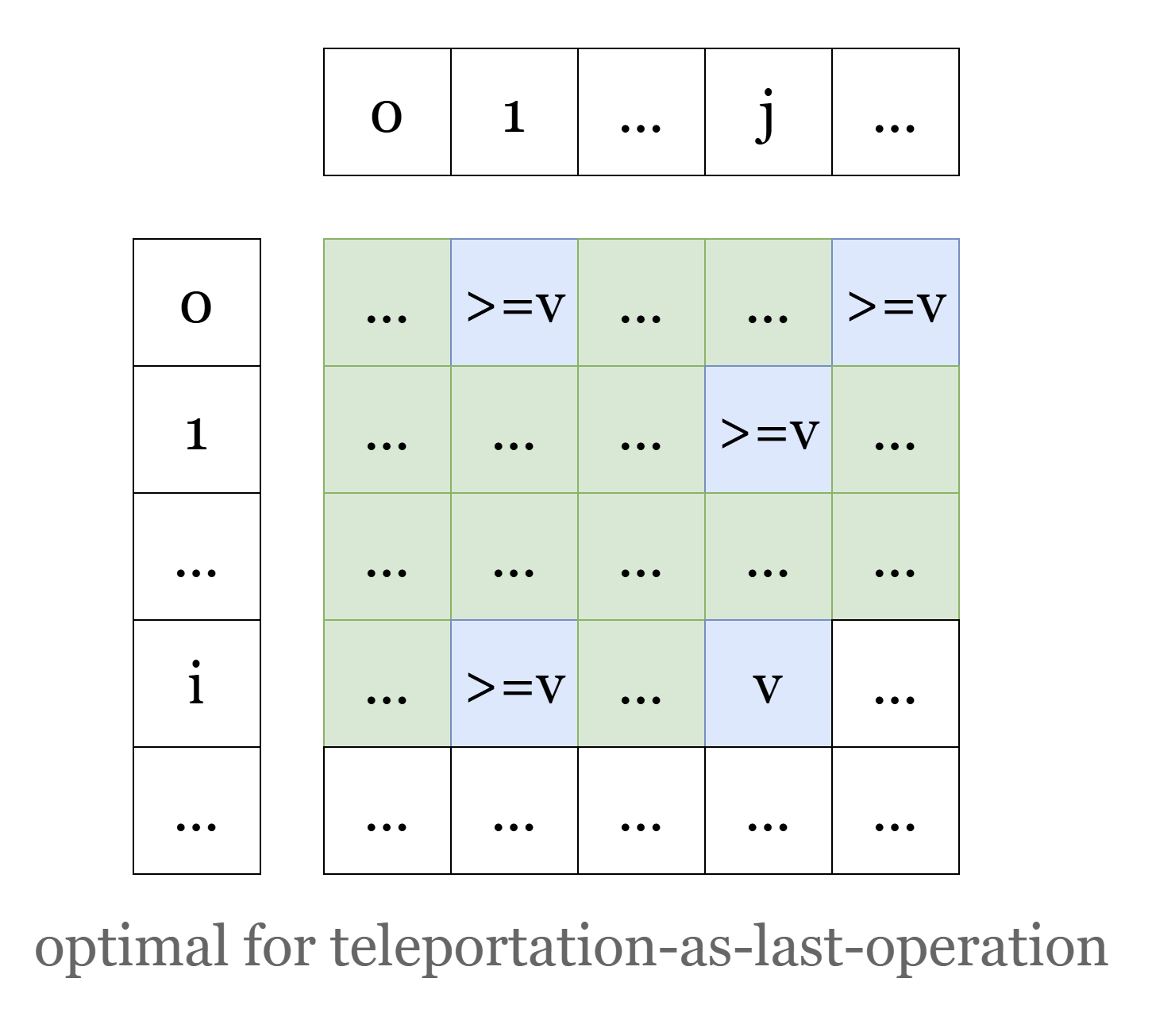 For example, still consider sub-question [layer][i][j], as the image show, let’s say all the green nodes have nodes weight , and all the blue nodes have weight , then the optimal value for “teleportation-as-last-operation” transfer should be the min value of the sub-question of those blue-highlighted nodes in layer layer - 1.