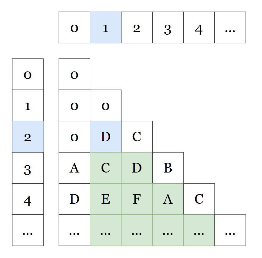 As the image above, when we goes from [2][0] to [1][1], before start searching, we first check if the sub questions of layer 2: B, D, C is in the cache.
