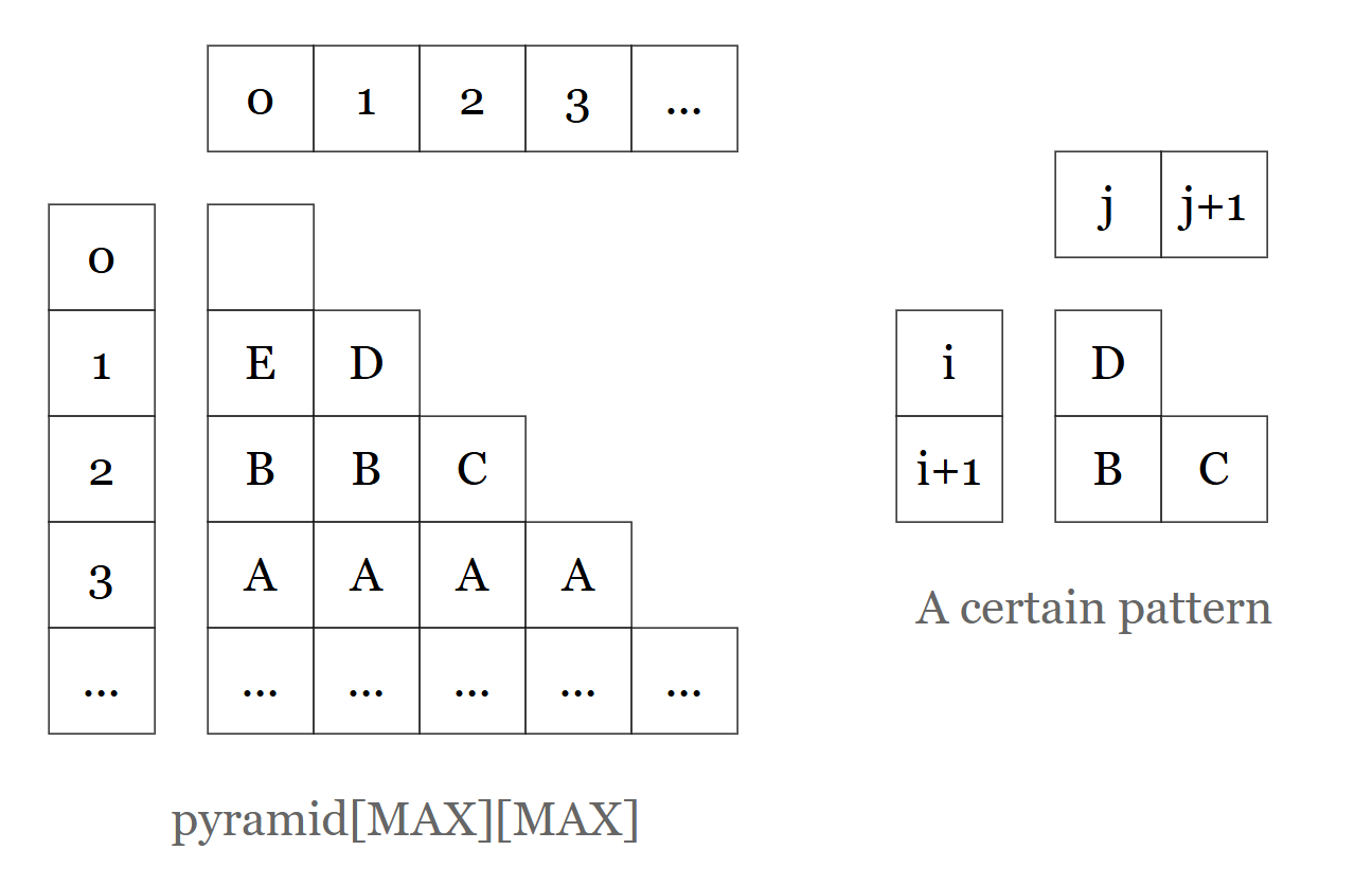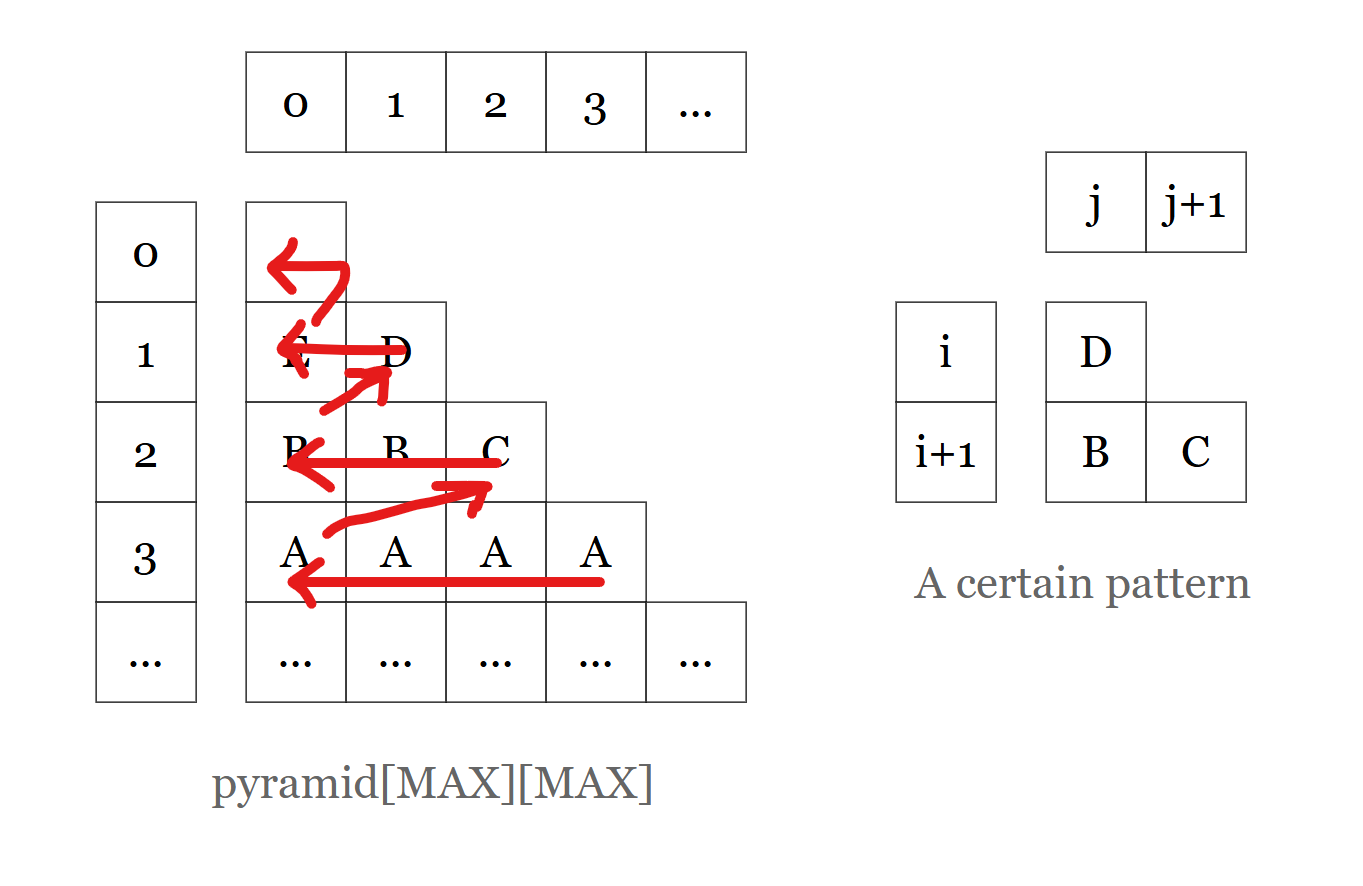 At the beginning, I’m actually thinking about another way of recording cache. That is, when we find a valid value for position [i][j], then if we use this position as pyramid top to consider the sub-pyramid, then all the layer should be able to considered a valid sequence as a sub question.